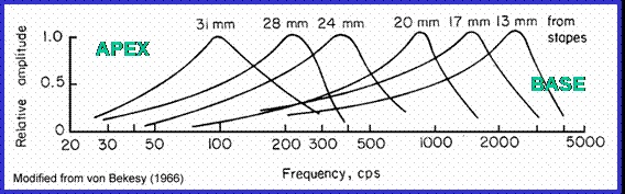 This inspired animation (© 1997 Howard Hughes Medical Institute) unrolls the basilar membrane to show that it is narrow at one end (the base) and broad at the other (the apex, nearest our point of view). Turn on the sound. The animation shows how the membrane responds to Bach’s most famous Toccata. Notice that high frequency tones resonate strongly at the narrow, base end of the membrane, and low frequency sounds resonate strongly at the apex, or broad end. Thus, the component frequencies of the incoming sound waves can be physically separated and separately measured for intensity. Frequency peaks can be mapped against the length of the membrane, as shown here.